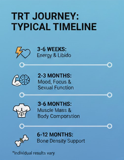 While individual results vary, many men follow a general pattern: improved energy and libido within three to six weeks, improved mood, focus, and sexual function within two to three months, noticeable changes in muscle mass and body composition within three to six months, and long-term benefits such as bone density support within six to twelve months.